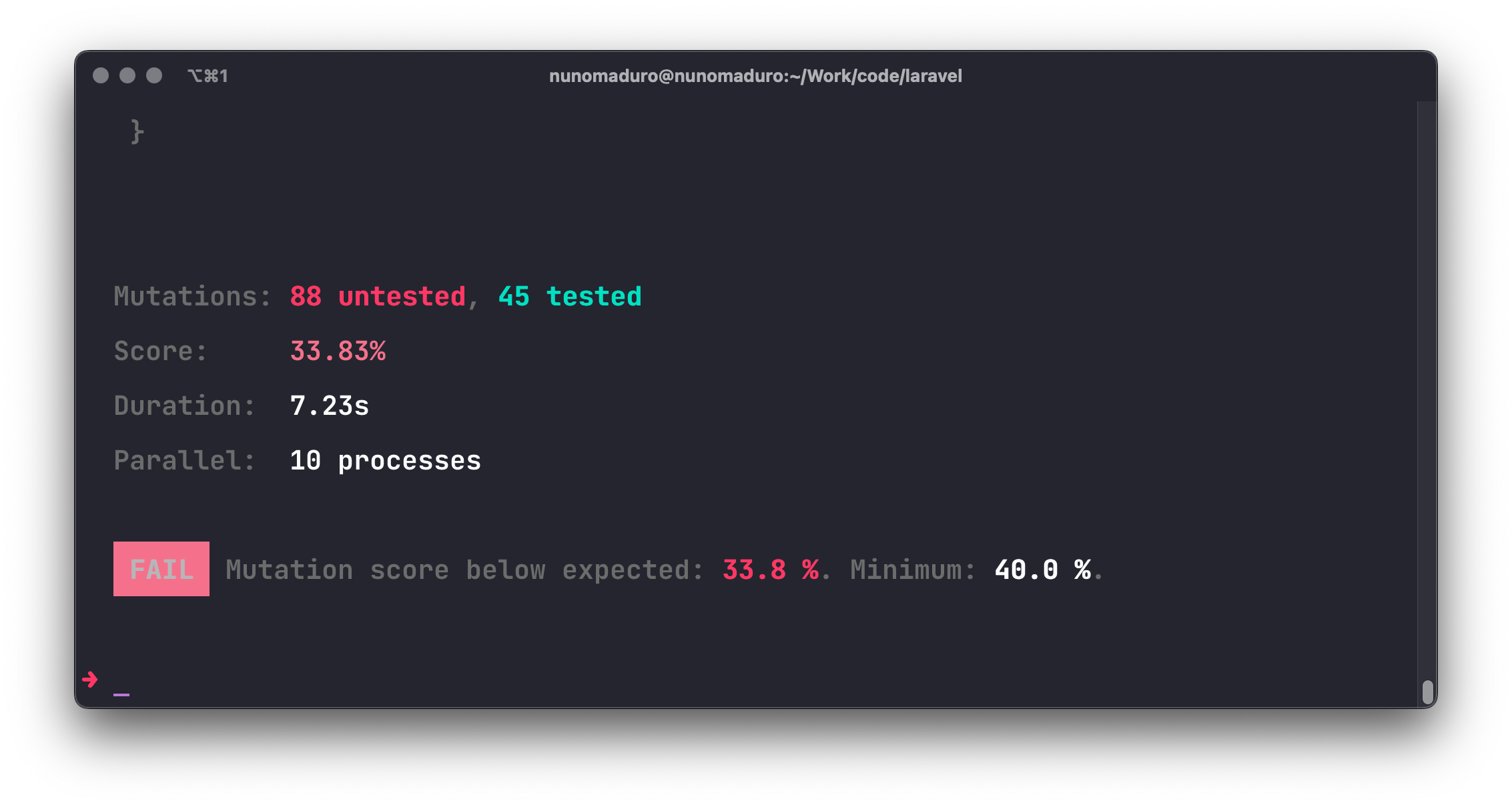 Then, run Pest PHP with the --mutate option to start mutation testing. Ideally, using the --parallel option to speed up the process.